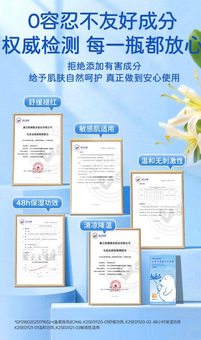 PEPA皮帕熊始终坚守金银花核心成分,获得美修全绿认证、权威机构检测、第三方咨询公司实力认证,产品经过多项检测认证,如舒缓褪红、敏感肌适用、温和(无刺激)、清凉降温、48H保温功效、无63项激素......保障每一瓶都放心,让婴童与敏肌宝宝都能安心使用。